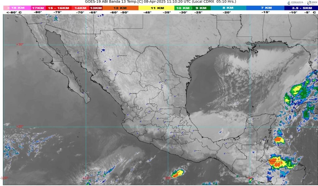 Estas condiciones producirán chubascos y lluvias fuertes en el sureste mexicano, incluida dicha península; también persistirá el evento de “Norte” en el litoral del golfo de México, la península de Yucatán, el istmo y golfo de Tehuantepec; así como ambiente frío a muy frío, durante la mañana y noche sobre el norte, noreste, oriente y centro del país.