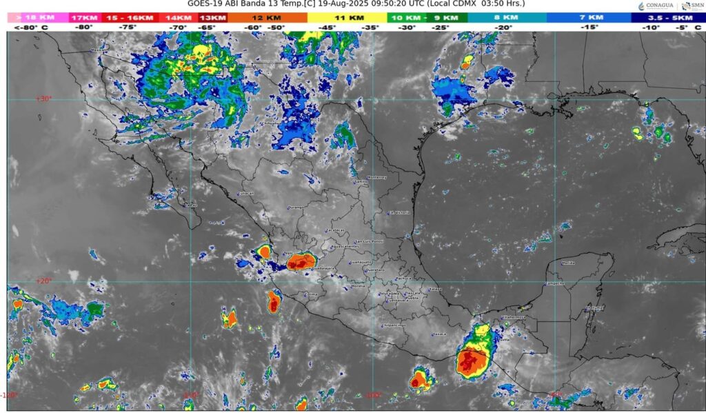 Un canal de baja presión sobre la Mesa del Norte y la Mesa Central, en interacción con el ingreso de aire húmedo del golfo de México y con inestabilidad atmosférica, generarán lluvias puntuales intensas en Oaxaca; puntuales muy fuertes en Veracruz, Guerrero y Michoacán; puntuales fuertes en Puebla, Morelos y Estado de México; chubascos en San Luis Potosí, Tlaxcala y Ciudad de México; y lluvias aisladas en zonas de Hidalgo, Querétaro, Guanajuato y Zacatecas.