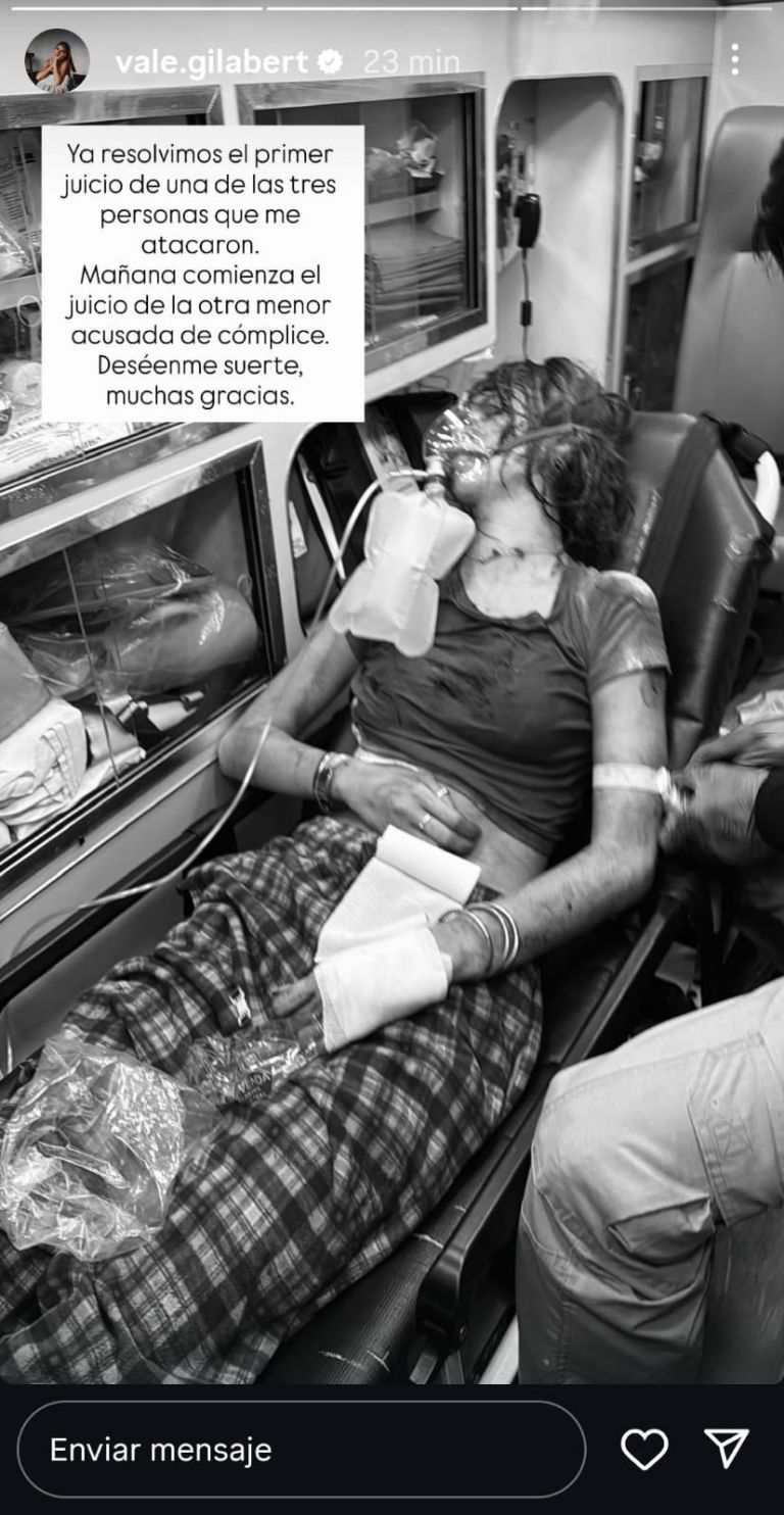 “Ya resolvimos el primer juicio de una de las tres personas que me atacaron. Mañana comienza el juicio de la otra menor acusada de cómplice, deséenme suerte, muchas gracias”, escribió Valentina sobre la foto.