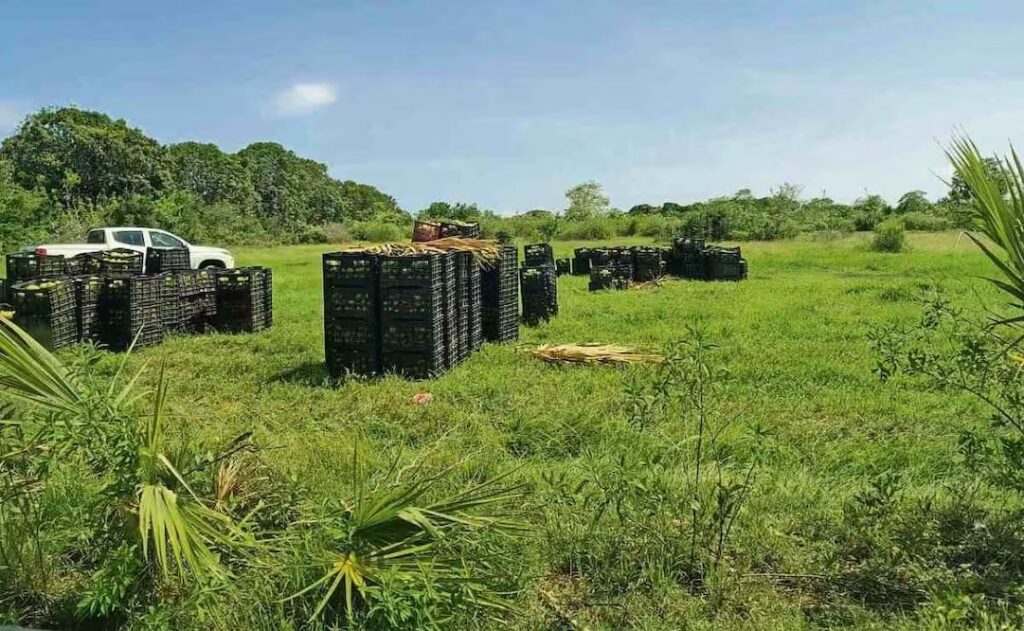 Un día antes del robo, el 19 de mayo, en menos de una hora al menos 100 personas que también se identificaron como “servidoras públicas de Bienestar” entraron al Polo de Desarrollo II para cortar y estibar el mango ataulfo de primera calidad que los marinos y trabajadores del Corredor Interoceánico resguardaban como parte de las ganancias de haber talado árboles en la construcción del Tren Interoceánico en el estado de Chiapas.