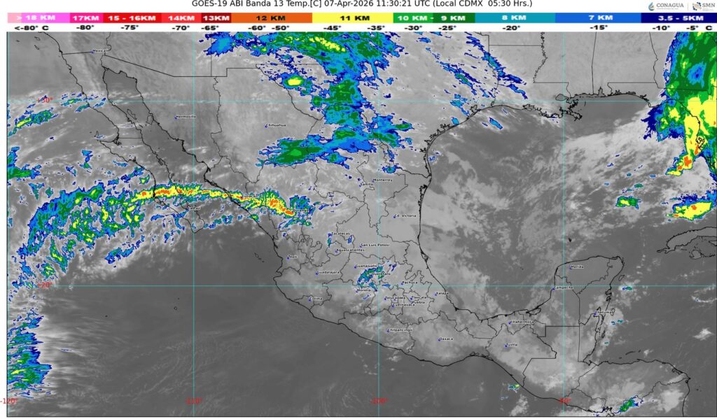 Por otra parte, un canal de baja presión al interior del territorio nacional, en combinación con el ingreso de humedad del océano Pacífico y golfo de México, originará lluvias y chubascos con descargas eléctricas en estados del norte, noreste, oriente, centro, occidente y sur de la República Mexicana.
